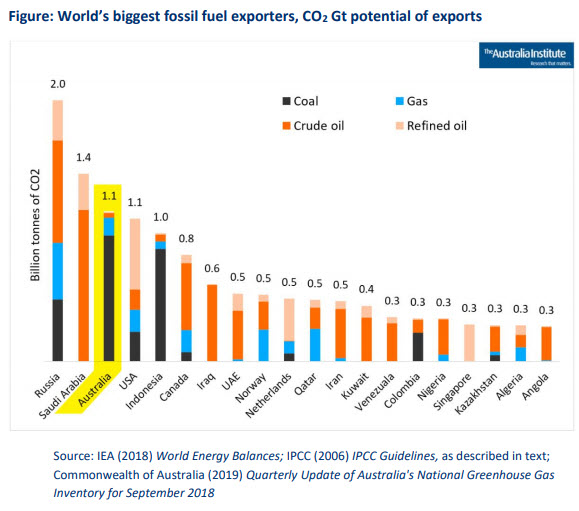 The climate impact of Australia’s fossil fuel (coal, oil, gas) exports ranks behind only Russia and Saudi Arabia exports in terms of global emissions, according to a report from the Australia Institute Climate & Energy Program.
